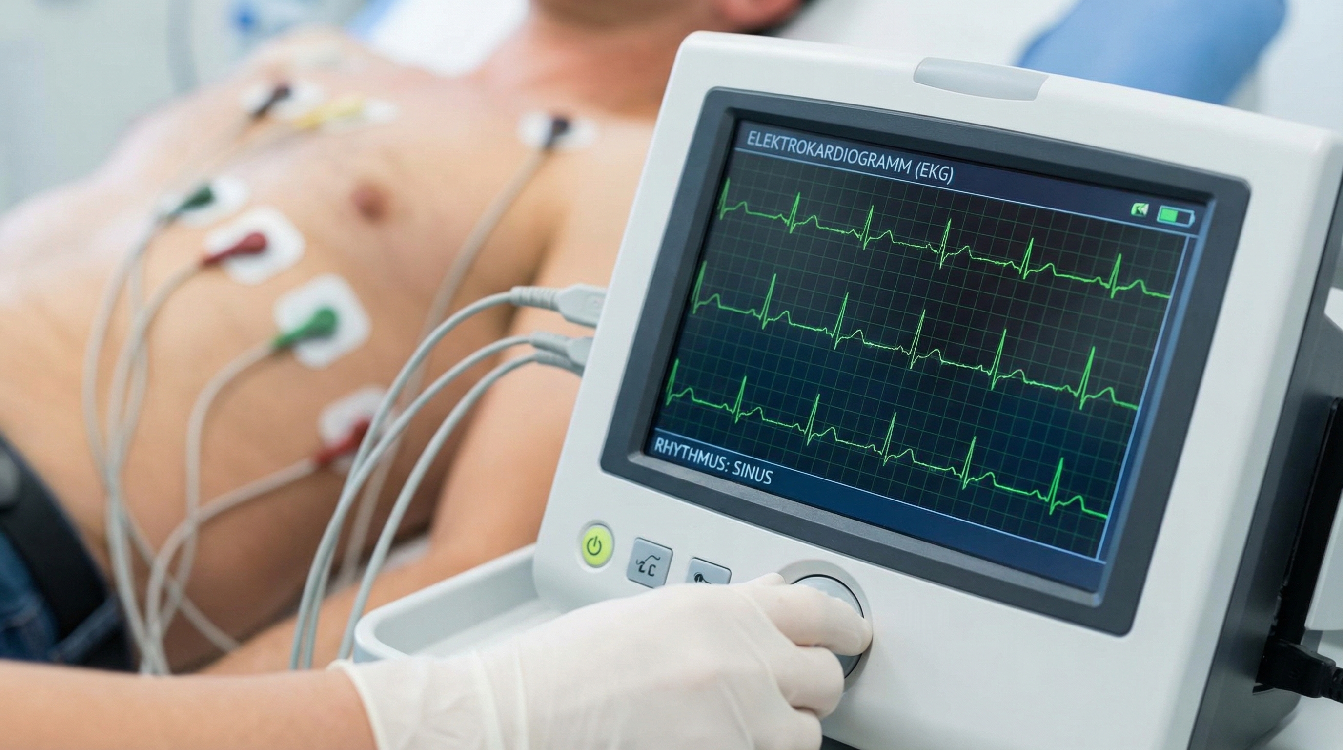 Das EKG ist eine einfache und schmerzfreie Untersuchung, bei der die elektrischen Aktivitäten des Herzens gemessen werden. Über kleine Elektroden auf der Haut können Herzrhythmus, Herzfrequenz und mögliche Durchblutungsstörungen beurteilt werden. So lassen sich Herzrhythmusstörungen, Herzinfarkte oder andere Veränderungen rasch und zuverlässig erkennen.